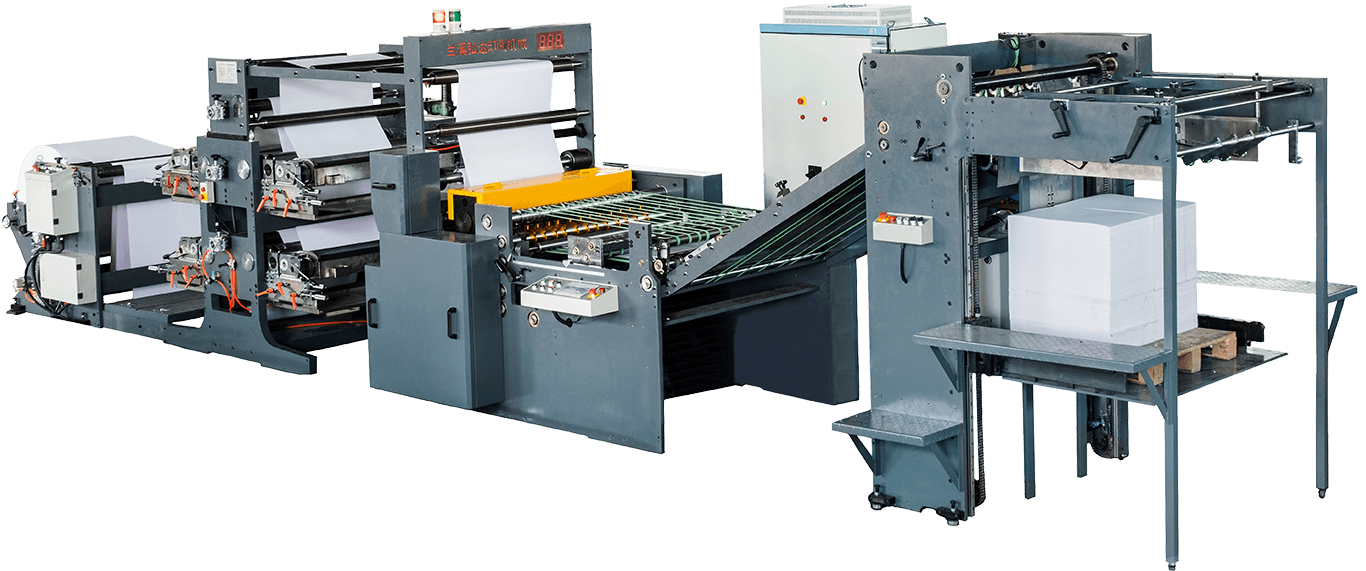 可自动输纸、印刷、打标、分切、齐纸、堆纸和自动计数电脑控制和显示器状态,是生产各种中高档薄本、信笺、练习本、账册等纸制品的理想机械。